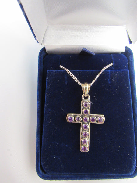 Elegant Sterling Silver cross with Amethyst gemstones on a sterling silver curb chain. Velvet gift box included. The perfect gift for any occasion.